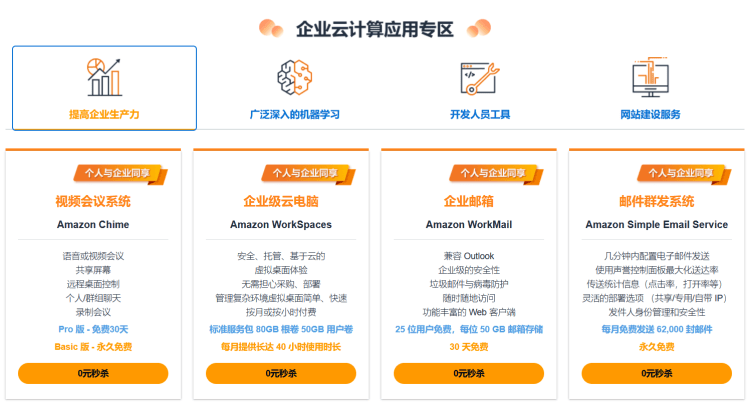 对于部分用户可能较多的会需要云服务器、数据库等,但是对于企业和个人开发者来说,可能会较多的需要应用产品。这个我们可以看到亚马逊云也有提供三个月的视频会议系统、一个月免费企业邮箱体验、每月免费62000封的群发邮件系统。当然还有包括深度学习系统、域名、CDN等开发工具和WEB应用等。