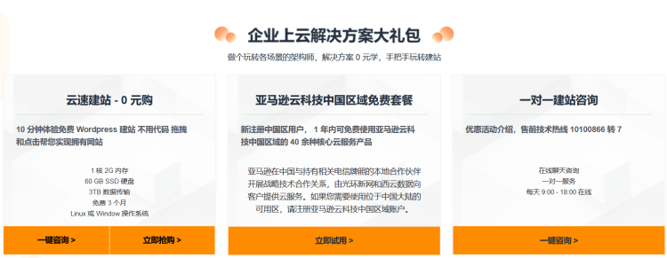 根据企业业务需要,我们还可以看到亚马逊云中国区套餐发布,当然中国区的业务目前仅限企业用户申请体验。对于企业建站也可以申请云速建站服务。
