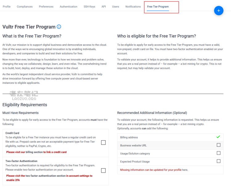 如果这几天有网友登录Vultr账户后台的时候是否有留意在ACCOUNT账户菜单中多了一项”Free Tier Program”。目前还在测试阶段,且如果有符合条件的是可以申请免费云服务器资格的。我们都知道,Vultr商家这么多年来一直针对新客注册账户有赠送注册余额体验活动,估计这样的活动已经越发视觉疲劳不能吸引到用户,开始尝试用新的营销产品。这里,我们看到的有 “Free Tier Program”活动计划。