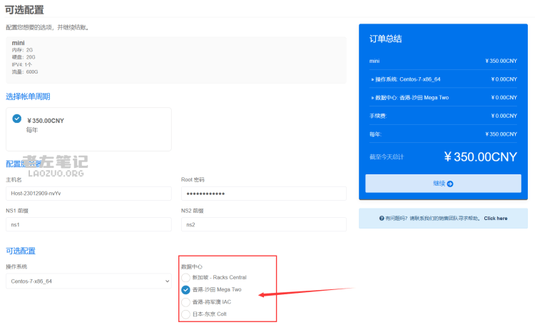 我们可以看到有新加坡、香港沙田、香港将军澳、日本东京四个机房可选。香港沙田机房是CN2优化线路。每月流量600GB,这个套餐据说支持每月20号可以工单申请重置一次流量统计。