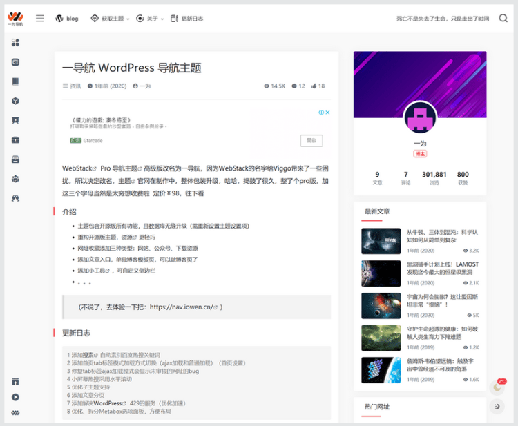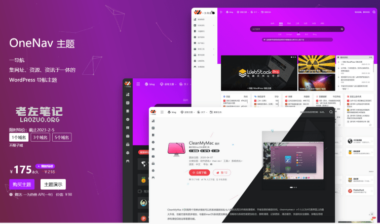 比如,我们用目录导航网站搭建收录收费的项目,或者是用来搭建优选推荐评测项目,或者是淘宝客导航网站等。在这里,老左推荐这款来自国内比较优秀的 OneNav 导航主题。OneNav 导航主题是我看到这几个导航主题模板中最为体验和功能实现满意的,我们可以根据提供的功能实现直连、详细页面,包括有资讯内容网站,以及可以实现下载站功能。包括外观,我们可以看到 OneNav 主题可以有多种的模式。集网址、资源、资讯于一体的WordPress 导航主题。