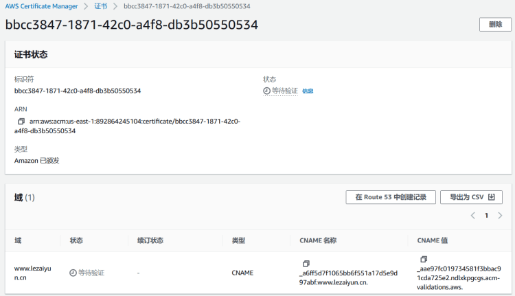 验证证书成功我们再添加域名是可以的。根据提示我们添加CNAME解析验证当前域名所有权,等待验证完毕才可以继续。