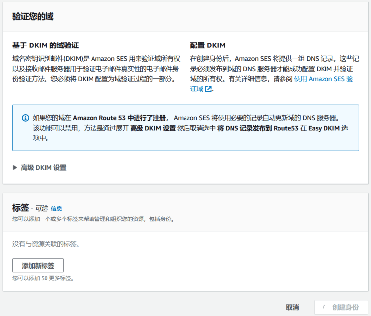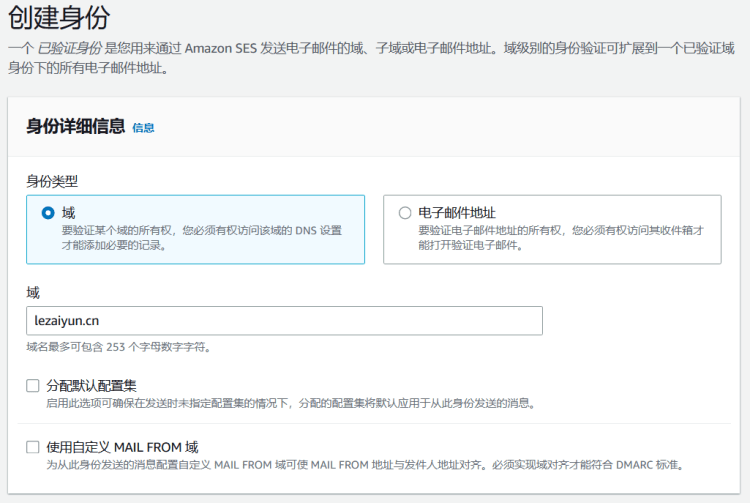 我们需要先创建一个身份,可以用域名验证或者是电子邮件地址,这里我用一个域名演示。