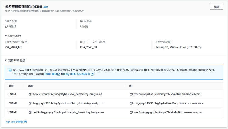 创建身份后,我们到域名DNS根据提示增加三个CNAME验证域名密钥识别。