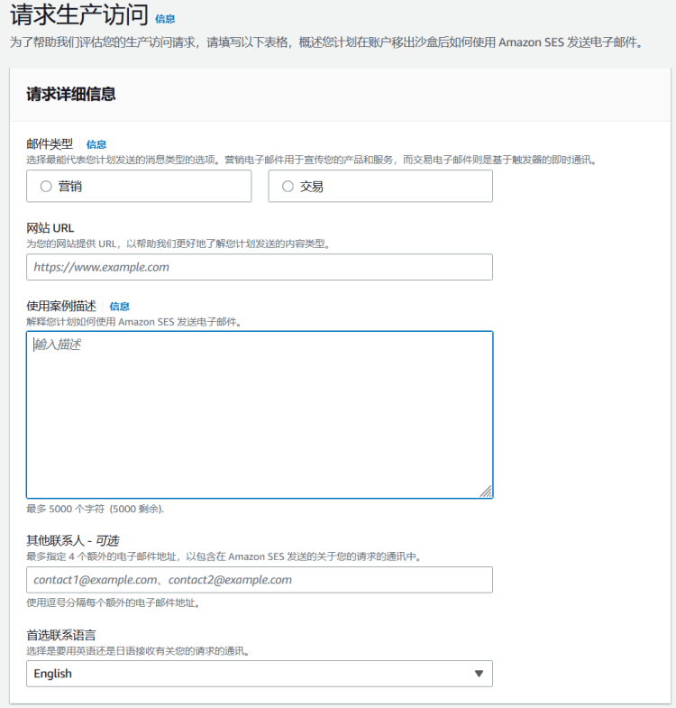 填写请求信息,审核信息后我们再可以解除沙盒后可以添加邮件列表和推送。包括后续可用使用 SMTP 接口或 API 发送电子邮件。