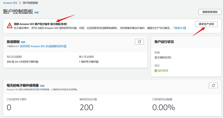 初次开通的SES账户,我们看到是在沙盒环境的,如果需要解除沙盒,可以请求。