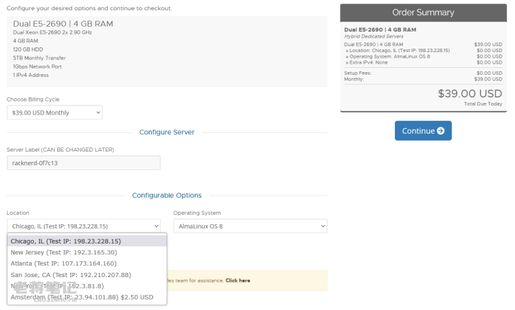 | 4核 | 8 GB | 250 GB HDD | 5TB@1Gbps | $59 | 选择 |