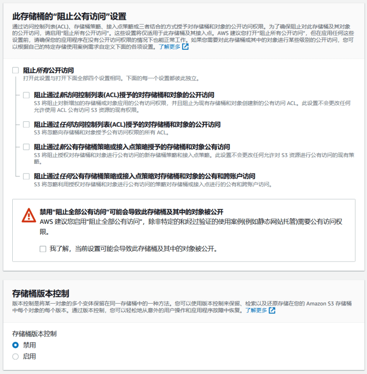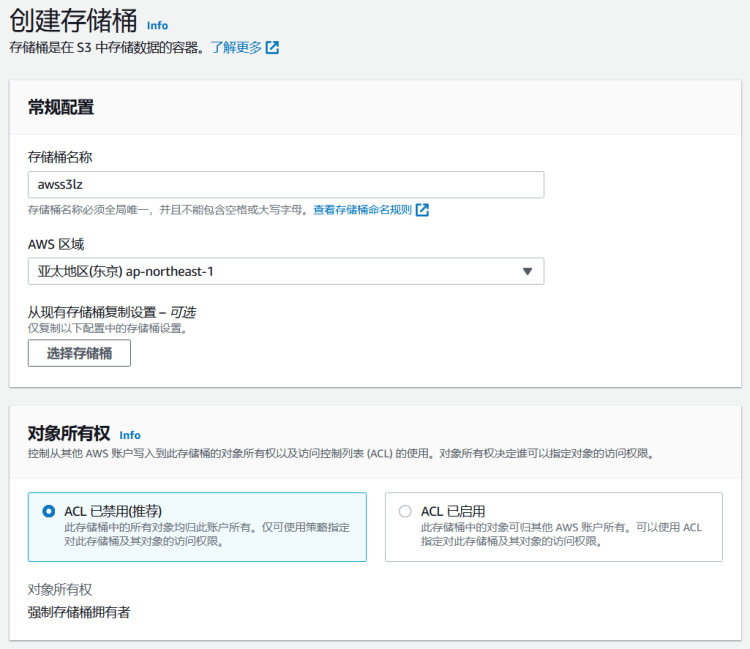 设置存储桶名称和选择区域。对象所有权选择ACL禁用,因为我们只需要当前存储桶功能不需要跨账户。
