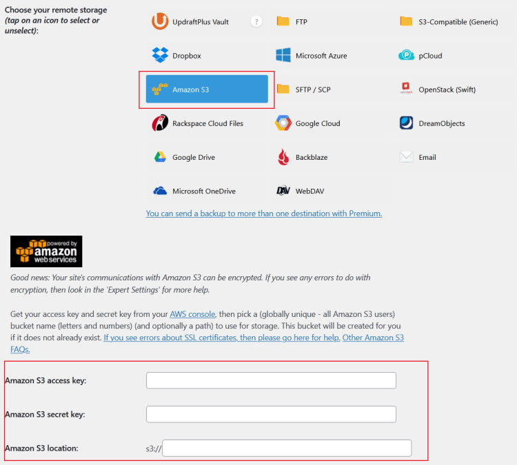 UpdraftPlus插件安装后,可以看到UpdraftPlus插件的设置项可以选择备份周期。然后可以选择存储空间包括亚马逊云S3,以及其他的常规对象存储。这里可以看到需要三个选项,AK、SK和存储桶。这里我们准备到亚马逊云开通存储桶。