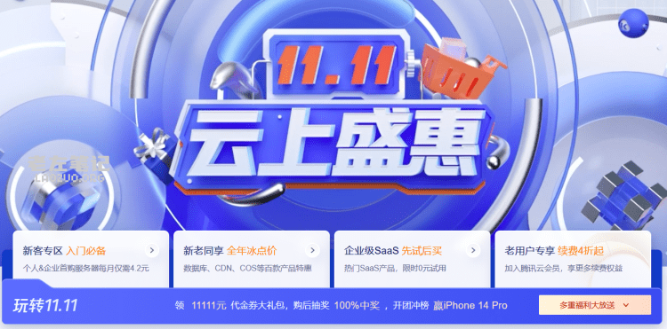 腾讯云双11有哪些优惠活动?从今天开始截止到月底,腾讯云双十一活动正式开启,但是之前在预热活动采购的也不要紧张,之前主要以云服务器为主且报价双十一的。今天开始的双十一正式活动只不过活动内容更丰富一些参与进来的产品更多一些,但是还是那些产品。腾讯云双十一活动活动力度对于新客企业和个人还是比较大的,这个我们应该知道,同时对于老客也是有优惠的。