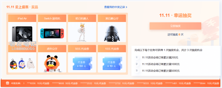 11.11活动订单满额可获最多3次抽奖机会,新款iPad等您来抽。