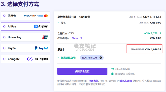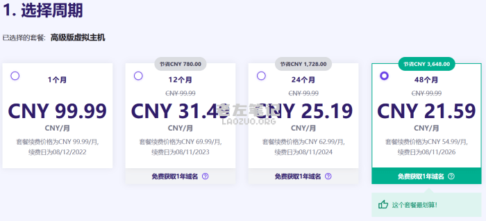这里我们测试看看高级套餐的共享虚拟主机,48个月。赠送一个域名一年。