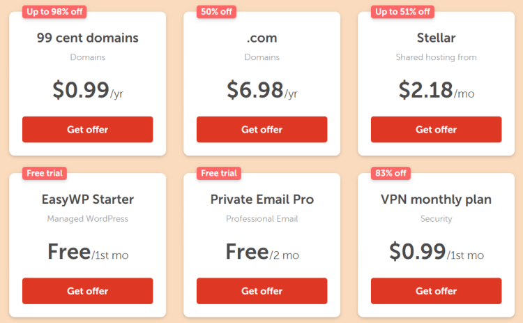 我们可以看到域名的优惠力度低至0.99美元,COM域名低至6.98美元,包括还有企业邮局、虚拟主机、SSL等。如果我们有准备注册域名的可以先将准备注册的域名准备好,然后时间到再注册,包括有需要转移域名的也可以先解锁和获取转移码。