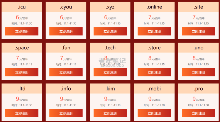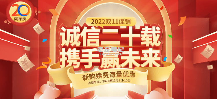 西部数码,我们有些朋友应该是有在其选购主机的,不过老左没有在他们家买过。他们家算是早年比较老牌的虚拟主机和域名销售平台,现在也有随着趋势新增 云服务器等产品。这不在双十一活动期间,也是其商家20周年的,有看到一些促销活动。如果有需要选择便宜域名和在其商家有产品需要续费和升级新购的,可以看看。