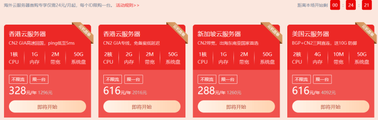 4款美国/新加坡/香港云服务器限量抢,不限流量,价格低至24元/月。活动期间,每天10点,14点,18点,22点,准时开秒,每个ID限购一台,秒完为止。