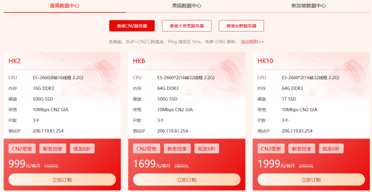 物理服务器特惠专区,香港/美国/新加坡可选!其中新加坡服务器低至3.8折,10M CN2每月仅需999元,新老同享,续费同价。