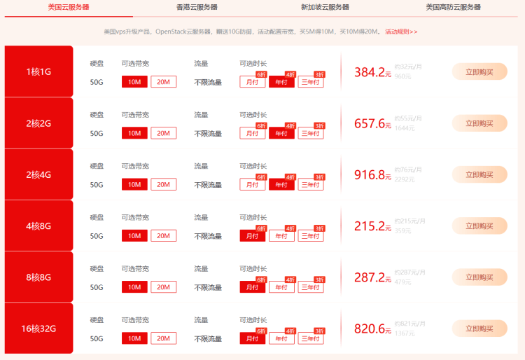 云服务器折上折,双向cn2精品带宽,免备案低延迟!现在购买月付6折,年付4折,三年付3折。此外,美国云在折扣的基础上叠加送带宽,买多少送多少,买5M得10M,买10M得20M!