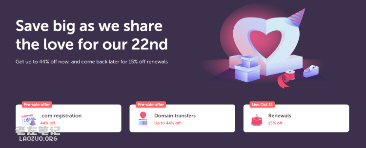 截止到10月13日,如果我们有需要选择新注册域名或者续费的话,可以选择参加NameCheap商家的22周年庆祝活动。他们的域名新注册和转入有40%折扣活动,比如.COM域名新注册和转入只需要7.88美元,续费产品15%的优惠。
