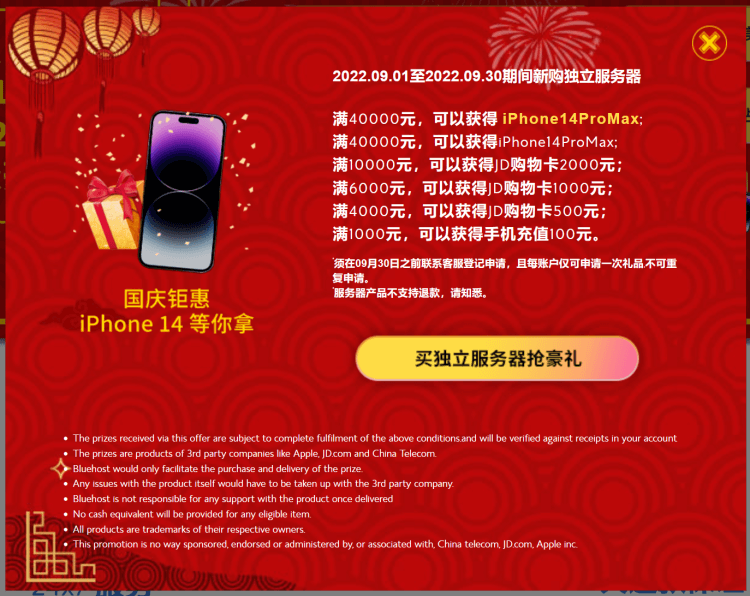 BlueHost 商家目前国际版和中国版是分开运营的,其中中国官网是针对中国用户消费需求部署的产品。比如沿袭原有的传统虚拟主机和云虚拟主机,数据中心包括中国香港、美国、印度和欧洲。同时还有VPS主机、独立服务器和站群多IP服务器等。这次国庆节也有促销活动,我们一起看看。