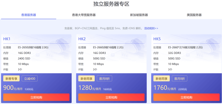 如果有需要独立服务器的,可以看到有香港服务器、大带宽香港服务器、新加坡和美国独立服务器。低至六折。