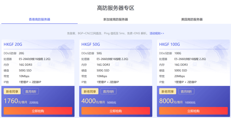 华纳云也有提供高防服务器,比如有香港、新加坡和美国高防服务器,最高100G防御能力。