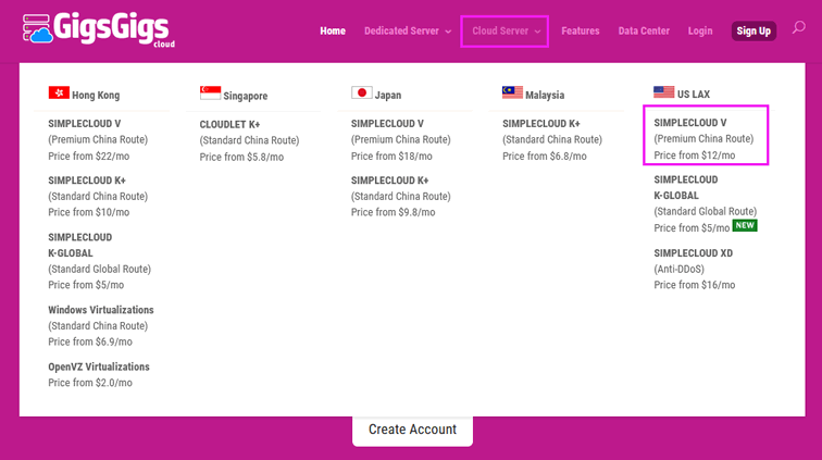 GigsGigsCloud 商家也有提供美国机房的云服务器和独立服务器业务,其中美国机房有普通非直连线路国际BGP线路,以及还有CN2 GIA中国线路优化线路。如果我们需要选择且也建议选择GigsGigsCloud商家美国CN2 GIA线路的是SimpleCloud V方案。