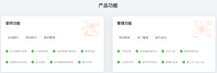 我们可以看到邮局的功能。支持多运营商、独立节点、云端设备等;安全性高,可提供智能分析、风险规避、实时备份、恢复机制等服务;便捷高效,能实现在线预览、无限发件、支持自有IP、扫码登录。