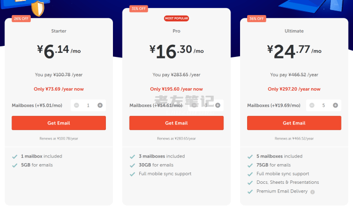 现在Namecheap商家的企业外贸邮箱目前有Starter、Pro、Platinum三种方案,分别区别在于存储空间大小和账户数量,如果外贸需要单独加账户是需要额外支付的。我们可以设置自己的域名作为邮局的后缀,凸显企业形象。