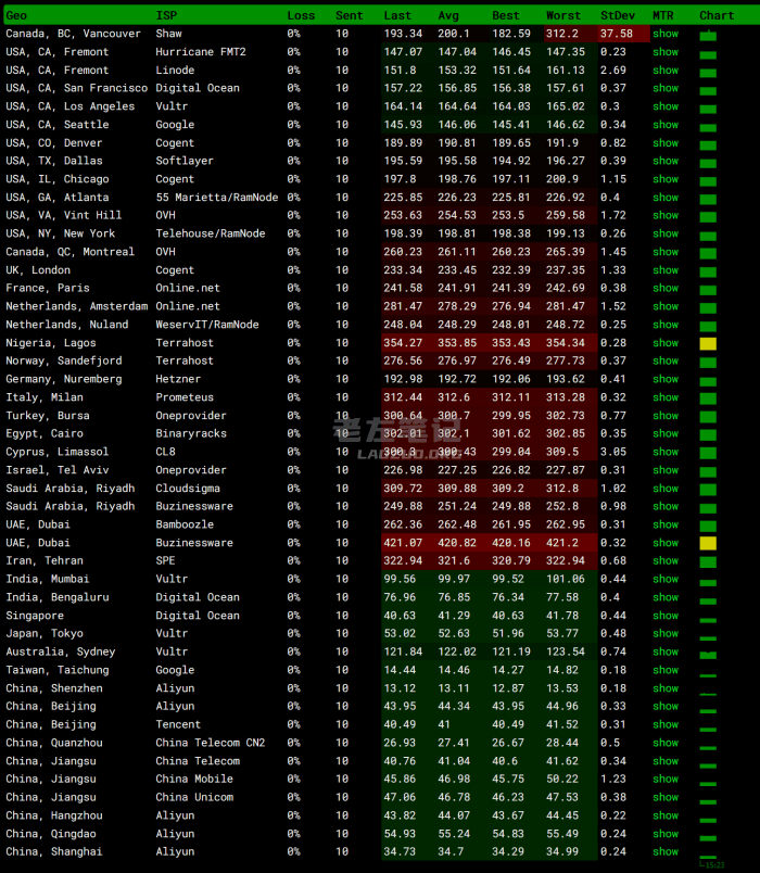 我们先用全网的测试节点测试下IP,随机测试节点。可以看到网络还算是稳定的。ping值还是比较低。