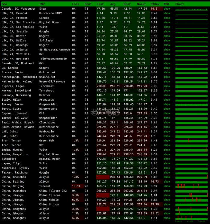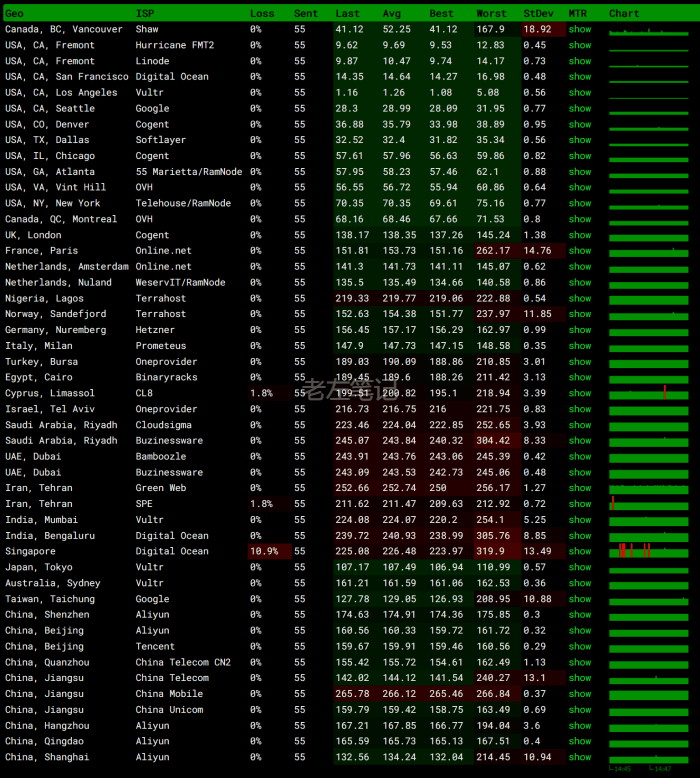 白天的话PING速度和CN2 GT没有多大区别,但是我们可以看到稳定性还是相对好一点。