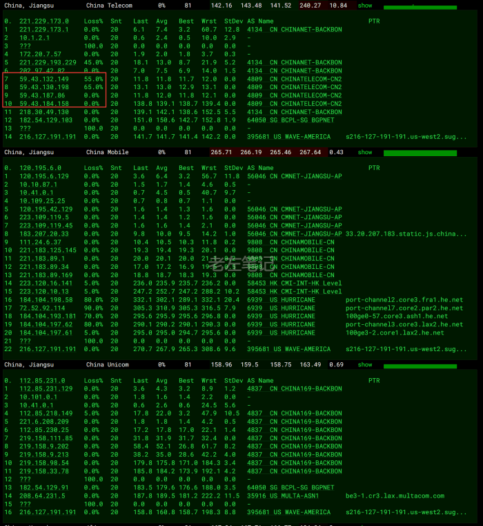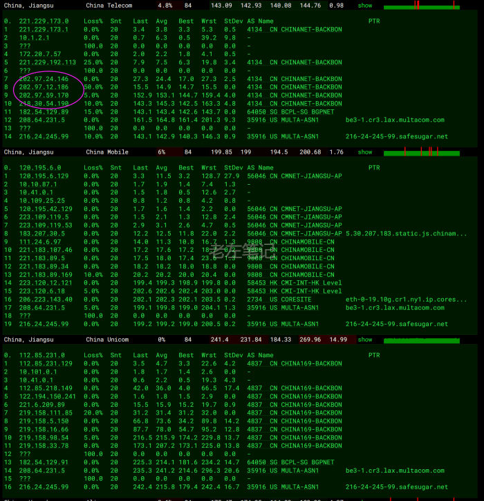 普通线路的江苏电信、移动、联通的路由去程。我们可以看到是走的202、97的CN2 GT普通163线路。
