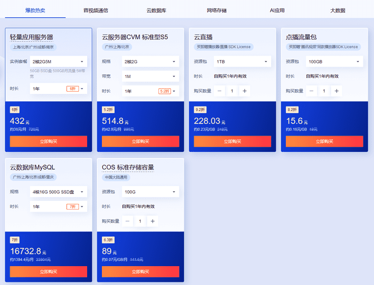 我们新老客户可以选择爆款云服务器、CDN、COS、云数据路等产品。前几天老左也有入手一台S5云服务器三年方案。
