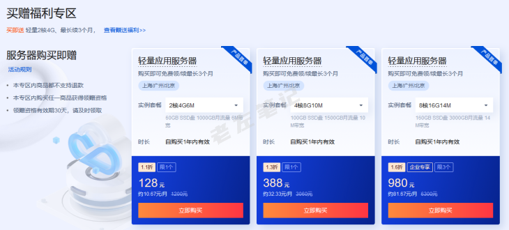 这里我们可以看到有三个买赠活动套餐。比如买一台轻量服务器128元,可以赠送一个月(个人)或者三个月(企业)。这样可以128元买到最多15个月的云服务器。或者我们也可以申请单独得到免费的赠送的机器对应的时间不当做续费时长。