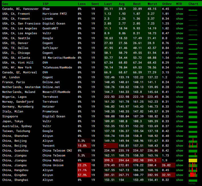 我们可以看到我们国内节点丢包还是有的,他们并不是CN2线路,这个也算正常。