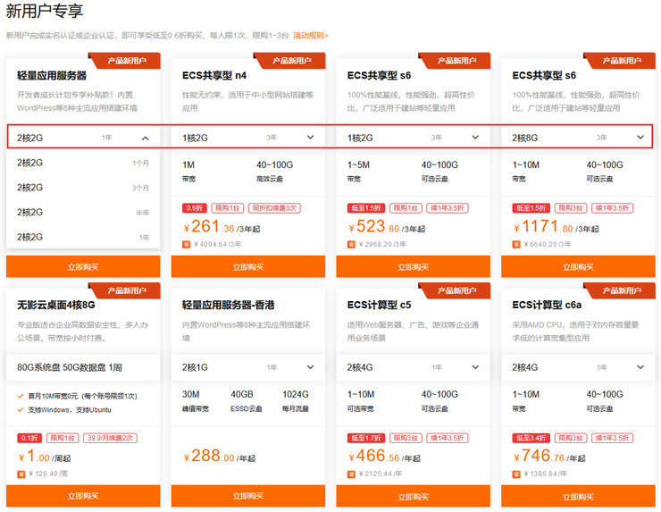 新用户完成实名认证或企业认证,即可享受低至0.6折购买,每人限1次,限购1~3台。我们看到2GB1M云服务器低至三年261元。