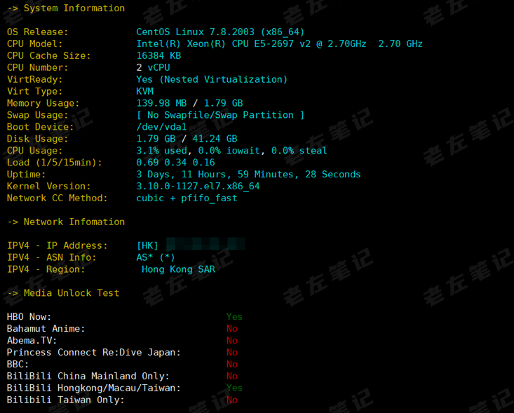 通过脚本测试当前香港云服务器的配置和流媒体支持情况。