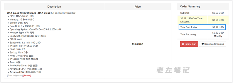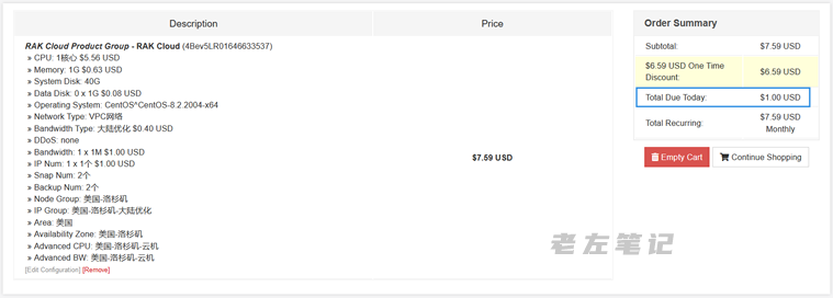 从 2022-Cloud-6.59 优惠码可以看的出来,应该是减去6.59美金,这里我测试香港机房看到方案不是1美元一个月。