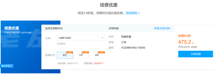 如果我们有轻量服务器在用的,也可以享受低至八八折的续费活动,三年续费是3.8折,如果准备长期用可以三年续费。
