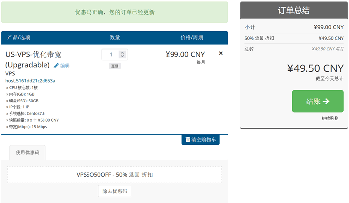 这里我们可以看到使用VPS五折优惠码之后才可以半价的。
