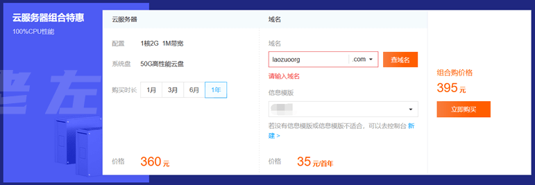 这里我们还可以购买云服务器组合,年付云服务器+一个COM域名只需要395元,这个还是相对便宜的。