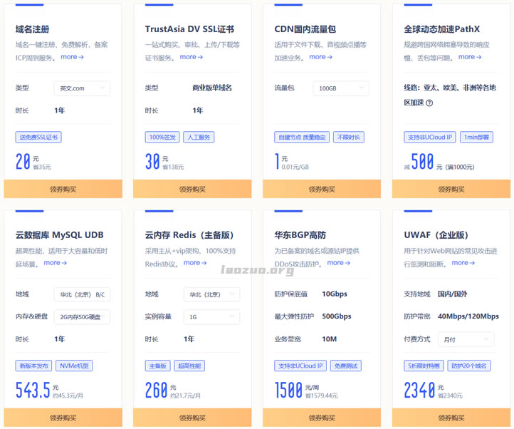 域名、SSL证书、云数据库、云内存、CDN、PathX、高防、UWAF普惠大促,新老用户均可购买,各产品限购1次。包括还有便宜域名。