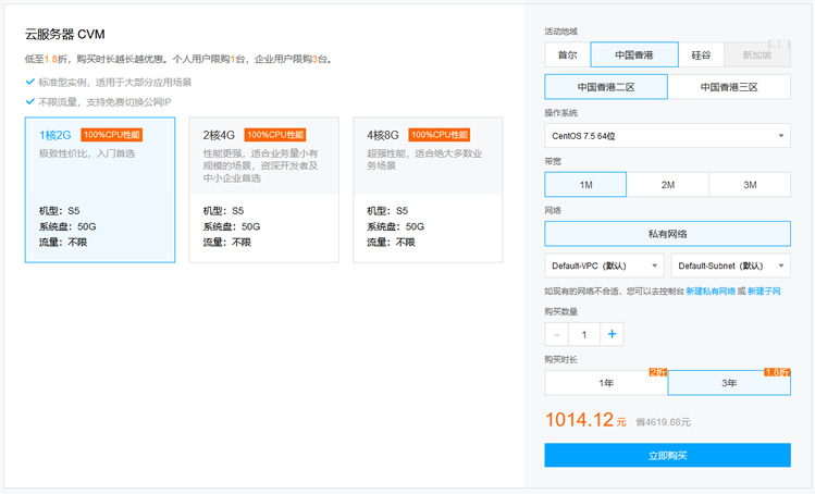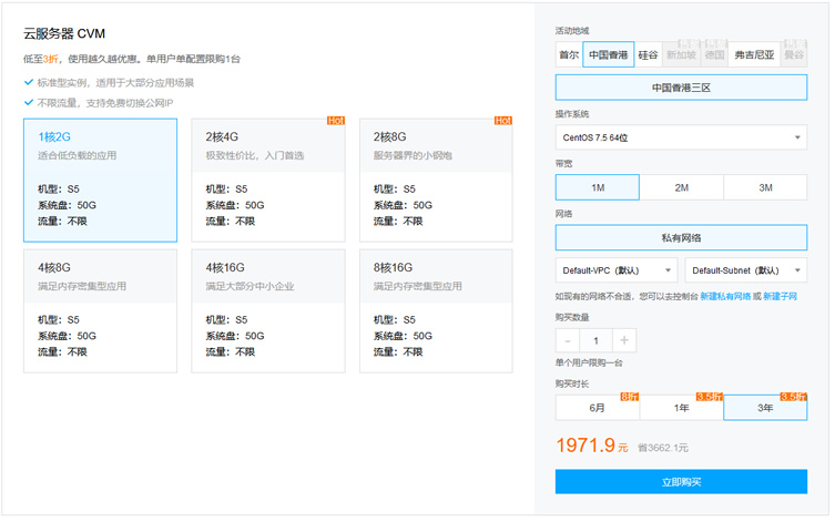 新客活动确实优惠,我们可以选择云服务器CVM方案,包括韩国首尔、中国香港、硅谷和新加坡机房,有的套餐是没有对应机房库存的。比如2G1M香港CVM服务器年付350元左右,三年1014元左右。