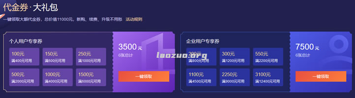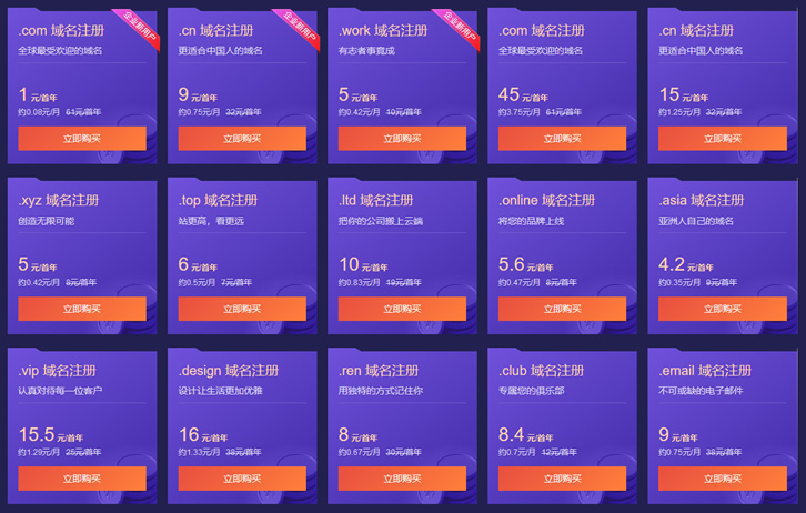 同时,如果我们有需要新注册域名的,也是有活动,一般我们还是建议注册COM或者CN,企业用户最低一年注册.COM域名。同时,如果我们有需要续费和升级的,那就需要领券代金券然后续费升级。
