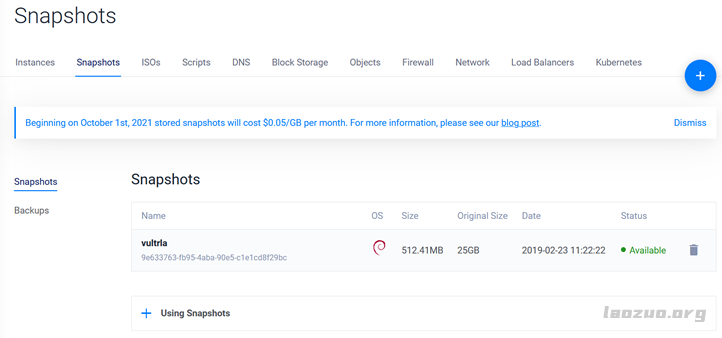 前几天老左在群里看到一个网友在叫嚷着自己的Vultr账户被扣费,检查自己的服务器后台也没有在用的服务器,服务器列表中是空的。我开始告诉他是不是上个月的时候有开通过机器然后删除,他说没有开通几个月,一直没有在用的服务器。于是我想到他应该是有快照存储还没有删除,因为从10月1日开始,VULTR快照是需要收费的。