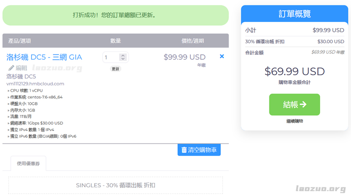 目前大家较为公认的是洛杉矶CN2 GIA三网优化线路是比较好的。一般来说,这个线路的商家价格也不便宜,比如我们熟悉的某DC6服务商季度49.99美元。这次我们看到在双十一期间,新晋的半月湾HMBCloud服务商有推出1G带宽的CN2 GIA,原价是年付99.99,这次七折后$69.99年付。