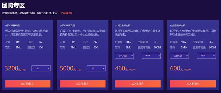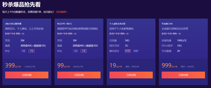 比如每天九点也有秒杀活动,云服务器低至99元一年。虚拟主机19元一年。