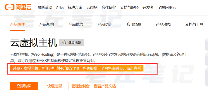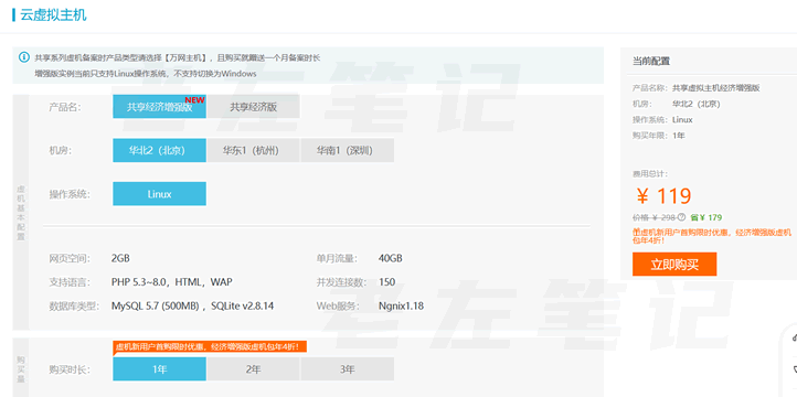 这个同学在阿里云注册的域名,老左就建议他看看阿里云目前的主机活动。共享虚拟主机年付119元适合个个人博客没有问题,如果要求高一点的话,可以选择独享虚拟主机。