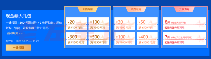 一键领取 1500 元满减券 +2 枚折扣券。原价新购、续费、云服务器升级时可用。