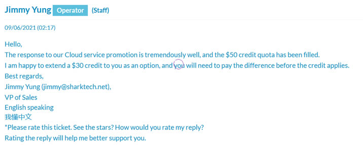 这是官方的客服留言回复信息。同时,如果我们和鲨鱼机房工单的时候是支持简体中文的。