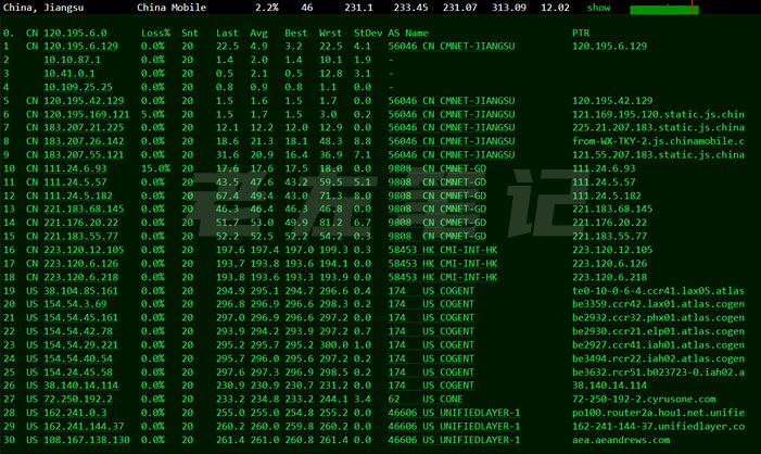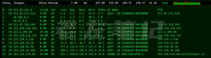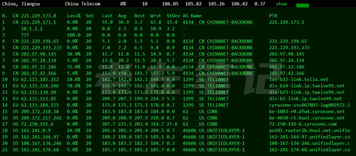 Traceroute to China, Beijing CU (TCP Mode, Max 30 Hop) ============================================================ traceroute to 123.125.99.1 (123.125.99.1), 30 hops max, 32 byte packets 1 162.241.174.3 3.69 ms AS46606 United States, Texas, Houston, unifiedlayer.com 2 108.167.138.133 0.61 ms AS46606 United States, Texas, Houston, websitewelcome.com 3 162.241.144.38 0.35 ms AS46606 United States, Texas, Houston, unifiedlayer.com 4 162.241.0.4 0.79 ms AS46606 United States, Texas, Houston, unifiedlayer.com 5 72.250.192.5 1.45 ms AS62 United States, Texas, Houston, cyrusone.com 6 62.115.184.144 1.63 ms AS1299 United States, Texas, Houston, telia.com 7 64.125.30.214 1.16 ms AS6461 United States, Texas, Houston, zayo.com 8 64.125.28.96 37.54 ms AS6461 United States, Texas, Houston, zayo.com 9 62.115.125.163 40.26 ms AS1299 United States, California, Los Angeles, telia.com 10 213.248.94.126 57.19 ms AS1299 United States, California, Los Angeles, telia.com 11 64.125.28.231 36.16 ms AS6461 United States, California, Los Angeles, zayo.com 12 219.158.3.141 201.97 ms AS4837 China, Beijing, ChinaUnicom 13 219.158.97.205 266.72 ms AS4837 China, Guangdong, Guangzhou, ChinaUnicom 14 * 15 219.158.6.185 281.34 ms AS4837 China, Beijing, ChinaUnicom 16 61.148.158.106 209.60 ms AS4808 China, Beijing, ChinaUnicom 17 61.135.113.158 202.09 ms AS4808 China, Beijing, ChinaUnicom 18 * 19 * 20 61.148.158.106 266.53 ms AS4808 China, Beijing, ChinaUnicom 21 123.125.99.1 204.11 ms AS4808 China, Beijing, ChinaUnicom Traceroute to China, Beijing CT (TCP Mode, Max 30 Hop) ============================================================ traceroute to 180.149.128.9 (180.149.128.9), 30 hops max, 32 byte packets 1 162.241.174.3 0.29 ms AS46606 United States, Texas, Houston, unifiedlayer.com 2 108.167.138.133 0.35 ms AS46606 United States, Texas, Houston, websitewelcome.com 3 162.241.144.98 0.33 ms AS46606 United States, Texas, Houston, unifiedlayer.com 4 162.241.0.8 2.07 ms AS46606 United States, Texas, Houston, unifiedlayer.com 5 72.250.192.5 1.45 ms AS62 United States, Texas, Houston, cyrusone.com 6 64.124.202.49 0.34 ms AS6461 United States, Texas, Houston, zayo.com 7 64.125.30.214 1.17 ms AS6461 United States, Texas, Houston, zayo.com 8 62.115.125.129 27.06 ms AS1299 United States, Virginia, Ashburn, telia.com 9 80.91.248.157 32.48 ms AS1299 United States, Virginia, Ashburn, telia.com 10 218.30.53.53 35.26 ms AS4134 United States, Virginia, Ashburn, ChinaTelecom 11 64.125.28.231 36.63 ms AS6461 United States, California, Los Angeles, zayo.com 12 64.125.15.95 40.87 ms AS6461 United States, California, Los Angeles, zayo.com 13 202.97.92.17 188.68 ms AS4134 China, Shanghai, ChinaTelecom 14 * 15 180.149.128.9 232.33 ms AS23724 China, Beijing, ChinaTelecom Traceroute to China, Beijing CM (TCP Mode, Max 30 Hop) ============================================================ traceroute to 211.136.25.153 (211.136.25.153), 30 hops max, 32 byte packets 1 162.241.174.3 0.94 ms AS46606 United States, Texas, Houston, unifiedlayer.com 2 108.167.138.129 0.47 ms AS46606 United States, Texas, Houston, websitewelcome.com 3 162.241.144.38 0.35 ms AS46606 United States, Texas, Houston, unifiedlayer.com 4 162.241.0.4 0.77 ms AS46606 United States, Texas, Houston, unifiedlayer.com 5 72.250.192.1 0.75 ms AS62 United States, Texas, Houston, cyrusone.com 6 62.115.184.144 1.40 ms AS1299 United States, Texas, Houston, telia.com 7 62.115.123.106 9.63 ms AS1299 United States, Texas, Dallas, telia.com 8 * 9 62.115.171.219 37.76 ms AS1299 United States, California, Los Angeles, telia.com 10 64.125.29.53 40.11 ms AS6461 United States, California, Los Angeles, zayo.com 11 * 12 * 13 223.120.6.217 36.44 ms AS58453 United States, California, Los Angeles, ChinaMobile 14 * 15 * 16 111.24.2.134 228.79 ms AS9808 China, Beijing, ChinaMobile 17 * 18 211.136.63.66 230.04 ms AS56048 China, Beijing, ChinaMobile 19 211.136.95.226 230.66 ms AS56048 China, Beijing, ChinaMobile 20 * 21 * 22 211.136.95.226 233.42 ms AS56048 China, Beijing, ChinaMobile 23 * 24 * 25 211.136.25.153 232.40 ms AS56048 China, Beijing, ChinaMobile Traceroute to China, Shanghai CU (TCP Mode, Max 30 Hop) ============================================================ traceroute to 58.247.8.158 (58.247.8.158), 30 hops max, 32 byte packets 1 162.241.174.3 0.37 ms AS46606 United States, Texas, Houston, unifiedlayer.com 2 108.167.138.133 0.32 ms AS46606 United States, Texas, Houston, websitewelcome.com 3 162.241.144.38 0.36 ms AS46606 United States, Texas, Houston, unifiedlayer.com 4 162.241.0.8 0.82 ms AS46606 United States, Texas, Houston, unifiedlayer.com 5 72.250.192.1 0.84 ms AS62 United States, Texas, Houston, cyrusone.com 6 62.115.184.144 1.52 ms AS1299 United States, Texas, Houston, telia.com 7 64.125.30.214 1.25 ms AS6461 United States, Texas, Houston, zayo.com 8 62.115.125.163 45.36 ms AS1299 United States, California, Los Angeles, telia.com 9 64.125.28.99 37.55 ms AS6461 United States, Texas, Dallas, zayo.com 10 64.125.29.53 36.10 ms AS6461 United States, California, Los Angeles, zayo.com 11 219.158.96.25 208.25 ms AS4837 China, Beijing, ChinaUnicom 12 219.158.22.142 226.51 ms AS4837 China, Shanghai, ChinaUnicom 13 219.158.6.185 230.16 ms AS4837 China, Beijing, ChinaUnicom 14 219.158.115.125 264.38 ms AS4837 China, ChinaUnicom 15 * 16 58.247.221.178 219.38 ms AS17621 China, Shanghai, ChinaUnicom 17 * 18 58.247.221.178 256.82 ms AS17621 China, Shanghai, ChinaUnicom 19 * 20 58.247.8.153 233.08 ms AS17621 China, Shanghai, ChinaUnicom 21 * 22 * 23 * 24 * 25 * 26 * 27 * 28 * 29 * 30 *
